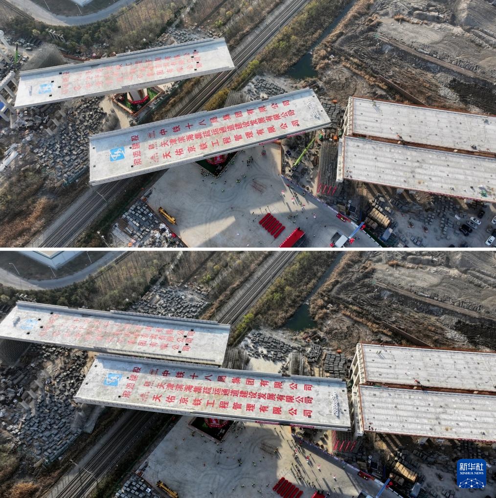 11月26日拍摄的新光高速公路金山铁路平转桥施工现场(碰撞照片、无人机照片)。由天津滨海建投基础设施管理有限公司承建的新港高速金山铁路平转桥项目于11月26日完成平转桥施工。项目承包商中铁十八局将两根1.4万吨旋转连续梁同步顺时针旋转60多度,历时约一个小时实现“完美旋转”。据了解,新港高速公路项目是助力京津冀协同发展的重大交通基础设施项目。主线起于京津唐高速与长深高速交汇处,止于天津港区海铁大道。全长约21.3公里,按照高速公路标准建造。项目建成后,将建成天津港与腹地之间的高速货物运输通道。货物运输时间预计缩短30%以上,年运输能力预计增至1.2亿吨。新华社供图 李然分页 11月26日拍摄的新港高速金山铁路平转桥施工现场。由天津滨海建投基础设施管理有限公司承建的新港高速金山铁路平转桥项目于11月26日完成平转桥施工。项目承包商中国铁路十八局将两根1.4万吨级连续旋转梁同步顺时针旋转60多度,历时约一个小时实现“完美旋转”。据了解,新港高速项目是重大交通基础设施项目有利于京津冀协同发展。主线起于京津唐高速与长深高速交汇处,止于天津港区海铁大道。全长约21.3公里,按高速公路标准建设。项目建成后,将建成天津港与腹地之间的高速货物运输通道。货物运输时间预计缩短30%以上,年运输能力预计增至1.2亿吨。新华社李兰凯版供图 11月26日,中铁十八局施工单位正在进行施工。由天津滨海建投基础设施管理有限公司承建的金山铁路跨越新光高速公路的平转桥项目于11月26日竣工。项目承包商,中国铁路十八局同步两根1.4万吨旋转连续梁,顺时针旋转60多度,用时约一个小时,实现“完美旋转”。据了解,新港高速公路项目是助力京津冀协同发展的重大交通基础设施项目。主线起于京津唐高速与长深高速交汇处,止于天津港区海铁大道。全长约21.3公里,按高速公路标准建设。项目建成后,将建成天津港与腹地之间的高速货物运输通道。货物运输时间预计缩短30%以上,年运输能力预计增至1.2亿吨。新华社供图 李冉PageBreak 施工现场照片(无人机拍摄)新港高速金山铁路平转桥(11月26日摄)。由天津滨海建投基础设施管理有限公司承建的新港高速金山铁路平转桥项目于11月26日完成平转桥施工。项目承包商中国铁路十八局仅用一小时就完成了两条1.4万吨级铁路的施工。旋转连续梁可同时顺时针旋转60度以上,提供“完美旋转”。据了解,新港高速公路项目是助力京津冀协同发展的重大交通基础设施项目。主线起于京津唐高速与长深高速交汇处,止于天津港区海铁大道。全长约21.3公里,建成高速公路y 标准。项目建成后,将建成天津港与腹地之间的高速货物运输通道。货物过境时间预计缩短30%以上,年运输能力将增至1.2亿吨。新华社供图 李冉分页 11月26日拍摄的新港高速金山铁路平转桥施工现场照片(无人机摄影)。由天津滨海建投基础设施管理有限公司承建的新港高速金山铁路平转桥项目于11月26日完成平转桥施工。该项目承建商中国第十八火车站同步两台1.4万吨级旋转连续桥光束并顺时针旋转超过60度,仅用了一个多小时就实现了“完美旋转”。据了解,新港高速公路项目是重大交通基础设施项目项目有利于京津冀协同发展。主线起于京津唐高速公路与长深高速公路交汇处,止于天津港区海铁大道。全长约21.3公里,按高速公路标准建设。项目建成后,将建成天津港与腹地之间的高速货物运输通道。货物运输时间预计缩短30%以上,年运输能力预计增至1.2亿吨。新华社记者 李兰 供图
