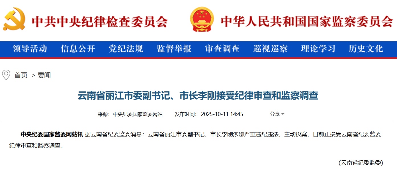 据云南省纪委监委消息,中共丽江市委副书记、云南省丽江市市长李刚因涉嫌严重违纪违法,已自首。目前正接受云南省纪委监委纪律审查和监察调查。