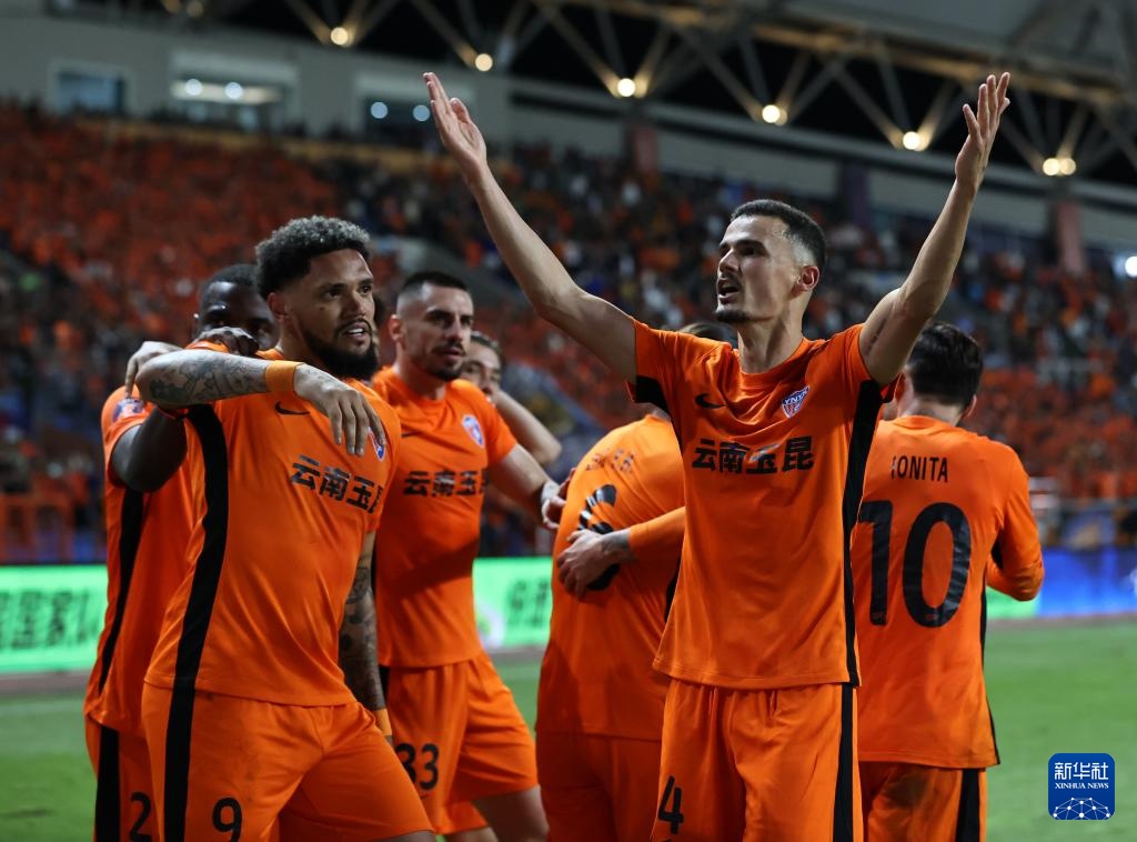 10月18日,云南育昆队球员佩德罗·恩里克(前排左)和内内(前排右)在比赛中庆祝进球。当日,在云南省玉溪市举行的2025年中国足球超级联赛第27轮比赛中,玉昆队主场2比0战胜天津金门虎队。新华社 姜文耀 供图 10月18日,云南队球员于昆内内(左上)与天津金门虎队球员黄家辉(右上)在一场比赛中争夺第一名。当日,在云南省玉溪市举行的2025年中国足球超级联赛第27轮比赛中,玉昆队主场2比0战胜天津金门虎队。新华社 姜文耀 供图 10月18日,云南玉昆队球员佩德罗·恩里克(右上)在比赛中头球破门。当天,在云南玉溪市举行的2025年中国足球超级联赛第27轮比赛中,玉昆队主场2比0战胜天津金门虎队省。新华社 姜文耀 供图 10月18日,云南玉昆队球员奥斯卡(上)在比赛中与天津金门虎队门将杨秉良进行较量。当日,在云南省玉溪市举行的2025年中国足球超级联赛第27轮比赛中,玉昆队主场2比0战胜天津金门虎队。新华社 姜文耀 供图 10月18日,天津金门虎队球员谢伟军(中)在比赛中遭到袭击。当日,在云南省玉溪市举行的2025年中国足球超级联赛第27轮比赛中,玉昆队主场2比0战胜天津金门虎队。供图:蒋文耀 习新社记者 华春莹 10月18日,云南玉昆队门将马震(左上)在比赛中遭到袭击。当日,在云南省玉溪市举行的2025年中国足球超级联赛第27轮比赛中,玉昆队主场2比0战胜天津金门虎队。奥文斯。新华社记者蒋文耀供图。 10月18日,云南玉昆队球员奥斯卡(前)在比赛中争夺球权。当日,在云南省玉溪市举行的2025年中国足球超级联赛第27轮比赛中,玉昆队主场2比0战胜天津金门虎队。图片提供:新华社记者姜文耀。